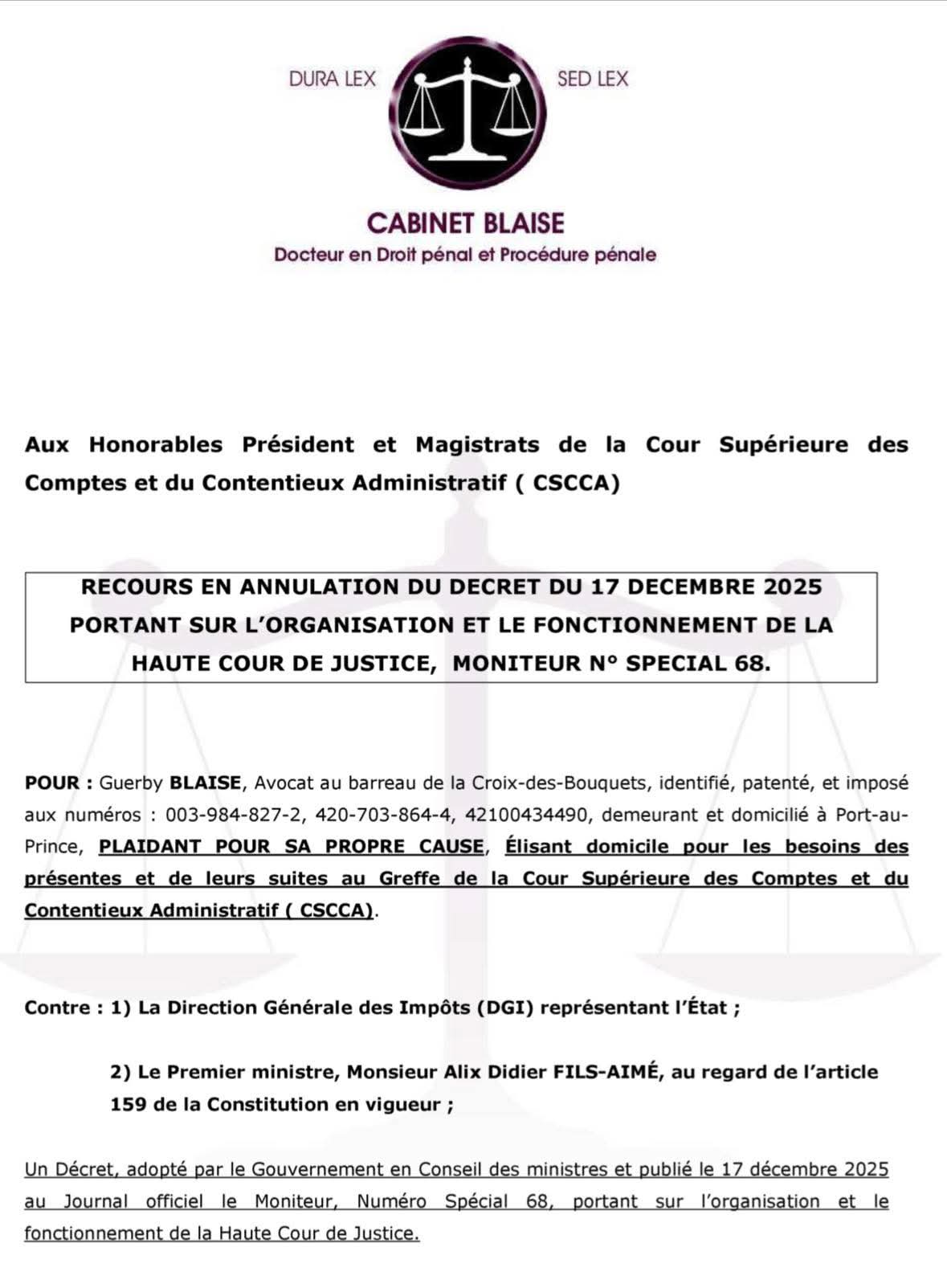 Que je soussigné, Monsieur Guerby BLAISE, entend par les présentes obtenir de la Cour l’annulation du Décret, publié le 17 décembre 2025, portant l’organisation et le fonctionnement de la Haute Cour de Justice.